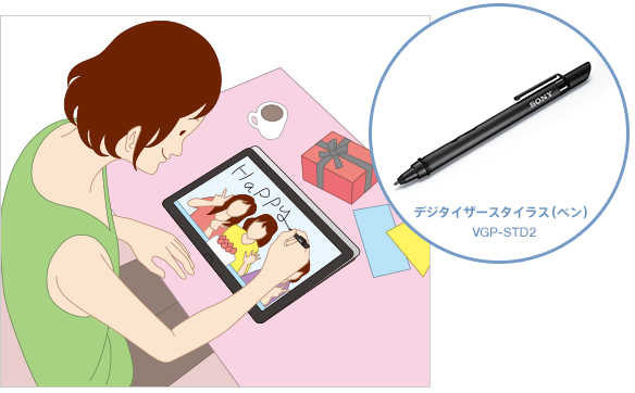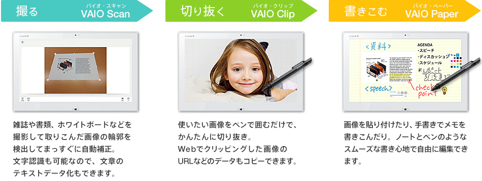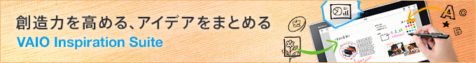 デジタイザースタイラス(ペン)(*)とVAIOの編集パッケージ「VAIO Inspiration Suite」の「VAIO Scan」「VAIO Clip」「VAIO Paper」を使ってアイデアをすぐ形にできます。たとえば、仕事で使う資料の作成や、家族や友人へ送る誕生日カードの作成など、さまざまなシーンで活用できます。