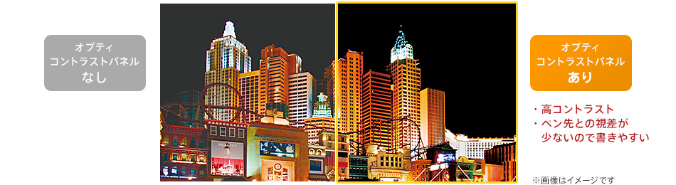 暗いシーンで美しく締まった黒を表現し高コントラストを実現したオプティコントラストパネルを採用。反射を抑えているため、デジタイザースタイラスのペン先が触れている部分と描いているもののギャップが少なく、快適にペン入力ができます。