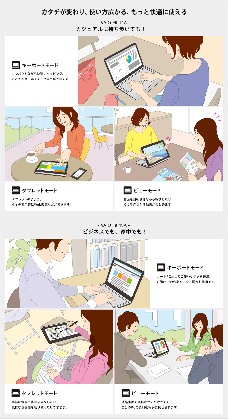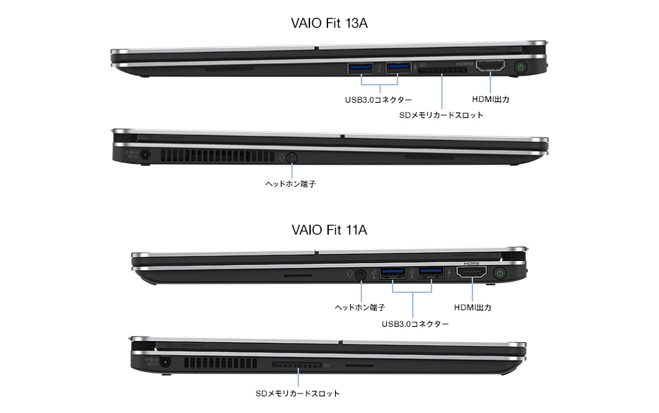 VAIO Fit 11Aは11.6型ワイド液晶搭載のコンパクトボディ。カバンに入れても持ち運びやすいサイズで、どこでもカジュアルに使えます。VAIO Fit 13Aは、13.3型ワイド液晶搭載で最薄部約14.3mmのスリムなボディ。バッテリーは約12時間の長時間駆動でスタミナ性能も十分。メインマシンとして外出先でも安心して使えるスタイリッシュなモバイルPCです。