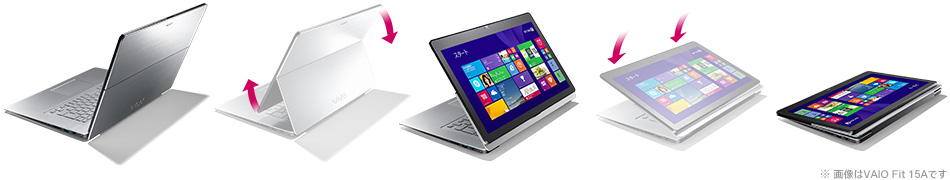 今まで通りの使い方ができるキーボードモードから、液晶画面を回転させて資料共有や画像閲覧に便利なビューモードに。そして、そのまま液晶面を上にして閉じればタッチ操作に最適なタブレットモードに。カタチを変えて、シーンに合わせて多彩な使い方ができます。さらに、タブレットモードで使いやすいソフトウェア「VAIO Inspiration Suite」も搭載。タッチやペン入力でクリエイティブに使えます。