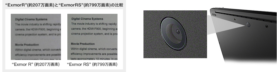 ソニー独自の「積層型構造」を採用した"Exmor RS for PC" CMOS センサーを搭載の8Mカメラを本体の背面に装備。高解像度なので、細かい文字も鮮明に撮影できます。外出先でも白板の打ち合わせ内容を写すなど、その場ですぐに撮影できて便利です。