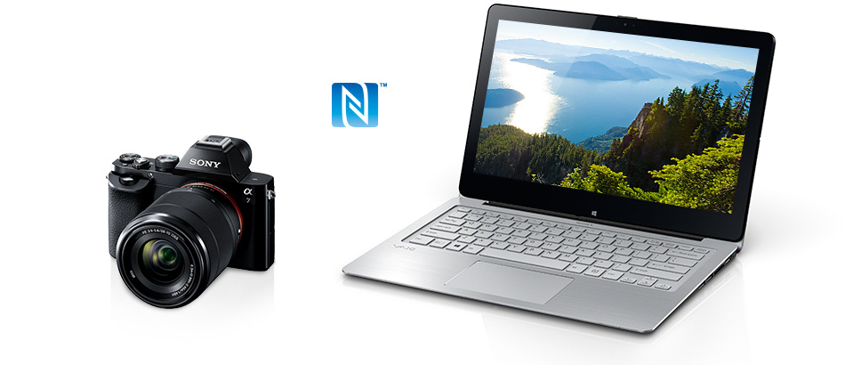 かざすだけで簡単にコンテンツやデータのやり取りができる新しい近距離無線通信技術、NFCに対応。たとえば、NFC対応のソニー製カメラをVAIOにかざすだけで、かんたんに写真・動画の転送ができます。撮影した写真をすぐにVAIOの美しい画面で楽しんだり、編集できるので写真の活用の幅が広がります。