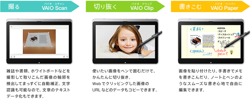 高性能背面カメラ+デジタイザースタイラス(ペン)とVAIOの編集パッケージ「VAIO Inspiration Suite」の「VAIO Scan」「VAIO Clip」「VAIO Paper」を使ってアイデアをすぐ形にできます。たとえば、仕事で使う資料の作成や、家族や友人へ送る誕生日カードの作成など、さまざまなシーンで活用できます。