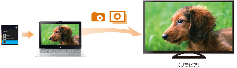VAIOに保存してある写真をみんなで見たいときは、リビングの大画面テレビでワイヤレス再生。「アルバムアプリ」から、簡単操作でホームネットワーク上の機器(*)にコンテンツをThrowして楽しめるので便利です。