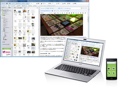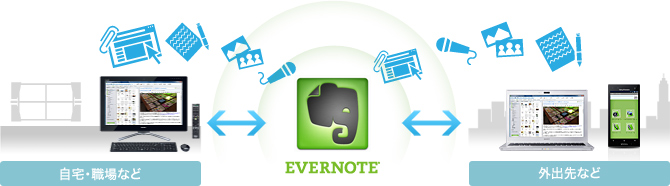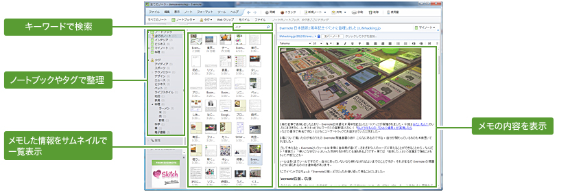 残しておきたいアイデアのメモ、Webの情報、想い出の写真など、さまざまなコンテンツを記録できます。しかも、ひとつのアカウントを取得すれば、自宅のPCやモバイルPC、スマートフォンなど、複数のデバイスから情報の記録や閲覧ができます。自宅でも外出先でも使える便利な記憶ツールです。