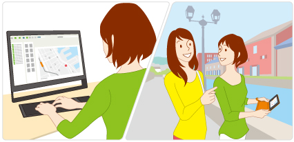 旅行先でモバイルPCを使いメモした情報を見ながら観光地めぐり。