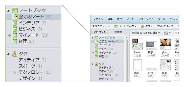 取りこんで保存されたノートは、テキスト検索ができるので便利です。さらに、種類別や目的別などにノートブックで分類したり、内容にそった複数のタグを付けて整理すると、もっと有効に活用できます。たとえば名刺なら、業種や会社別にノートブックを分け、セクション別や担当別などのタグを付けておくと、後で目的の名刺をカンタンに探しだせます。