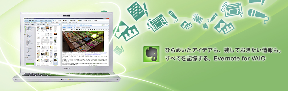 考えたこと、見たもの、経験したことを一カ所にまとめて記録できます。議事録やアイデアメモといったテキスト。気になるWebページの情報。デジタルスチルカメラで撮った写真。さらに、音声メモやメールまで、Evernote for VAIOに保存できます。