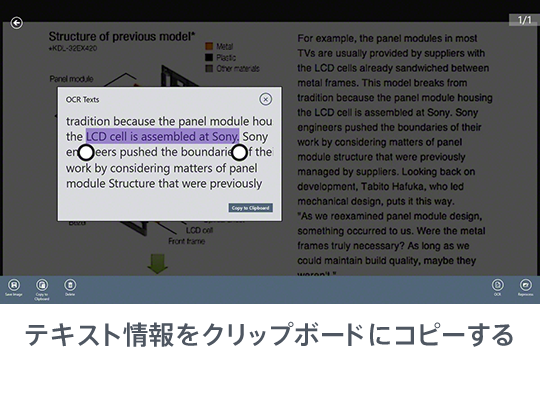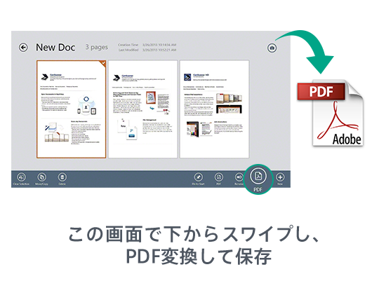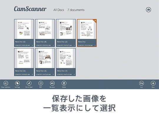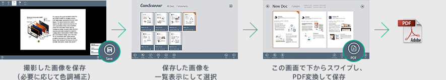 撮影した画像を、必要に応じて色調補正しPDF形式で保存できます。しかも、台形に撮影された紙画像も簡単に長方形に補正できます。また、OCR機能により、画像内の文章をテキスト情報として活用。さらに、他のWindows 8アプリに共有することも可能。画像データを資料として手軽に利用することができます。