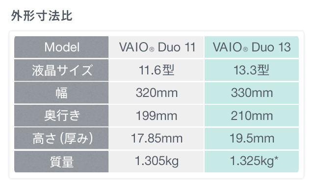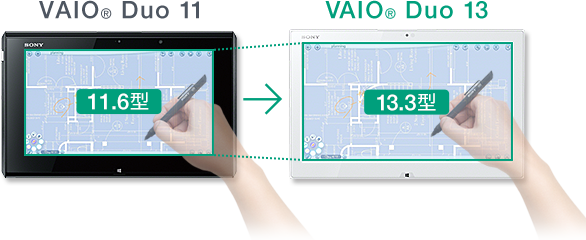 VAIO Duo 13は、VAIO Duo 11のモバイルPCとしての使いやすいサイズをほぼ継承しながら、液晶インチサイズが13.3型と大幅アップ。Webの閲覧領域も広くて見やすく、メモ帳の手書き入力も広いスペースを使ってラクに行えます。