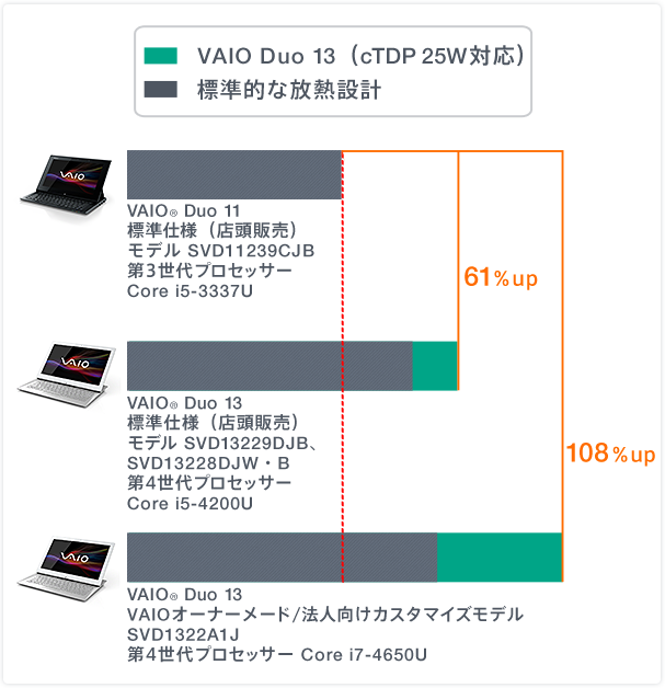 最新の第4世代インテル® Core™ プロセッサー・ファミリーを搭載。通常使用時の性能がアップ。さらに、VAIOが培ってきた高い放熱設計技術により、cTDP 機能をサポート。薄型ボディで25Wの放熱設計に対応し、圧倒的なパフォーマンスを実現。高いグラフィックス性能を実現し、さまざまな動画や写真の編集をより快適に行えます。
