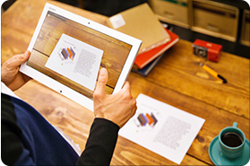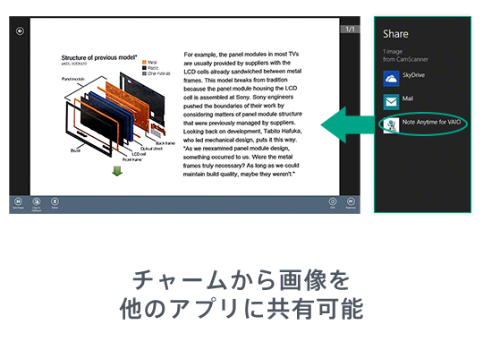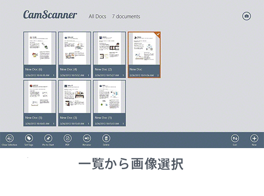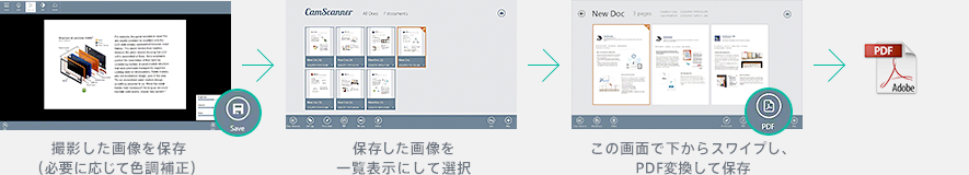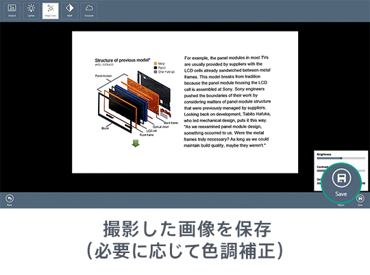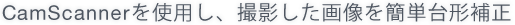 撮影した画像を、必要に応じて色調補正しPDF形式で保存できます。しかも、台形に撮影された紙画像も簡単に長方形に補正できます。また、OCR機能により、画像内の文章をテキスト情報として活用。さらに、他のWindows 8アプリに共有することも可能。画像データを資料として手軽に利用することができます。