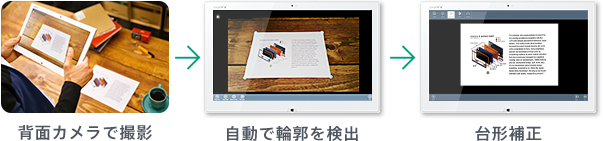 高性能"Exmor RS for PC" CMOS センサーを搭載した背面の8Mカメラを利用。「CamScanner(カムスキャナー)」を使えば、撮影した画像を簡単に台形補正できます。紙の資料や白板書きの内容を斜めのアングルで撮影しても、正面の見やすい画像で保存できます。