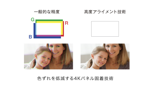 プロ用カメラのイメージャー固着技術をベースに「4K“SXRD”」固着に展開し、パネルを高解像度化することで各パネルの精度が向上しました。パネルを高精細化することで要求されるパネルアライメントの高い精度を満たすための高度な光学部品設計、そしてより高い要求レベルを満たすための位置補正機能を採用。これにより、画素の色ずれが原因で発生する色の濁りやにじみの少ない、正確な色再現を可能にしました。