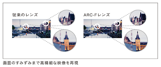 4Kプロジェクターの高解像度な映像を正確に投写するには、レンズや光学ブロックの精度も重要になります。フルHD“SXRD”プロジェクターレンズ技術と4Kデジタルシネマ用レンズ技術を融合させて大口径4K「ARC-F(All Range Crisp Focus Lens)」レンズを開発しました。レンズの数は4Kデジタルシネマ用プロジェクターと同様の18枚使用し、フローティングフォーカス方式を採用。フォーカス時に2つのレンズ群を可動させることで、画面の中心部から周辺部、また、近距離投写時から遠距離投写時まで安定した結像性能を実現しました。さらに、4Kパネルアライメント技術の採用に加え、レンズ素材には、緑/青/赤の屈折率の違いを考慮した特殊低分散ガラスを使用。色にじみの少ない鮮明な結像が得られます。「4K“SXRD”」の画素間ピッチ4μmという緻密な画素からの映像も忠実に解像して投写画面のすみずみまで高品位な映像を再現します。