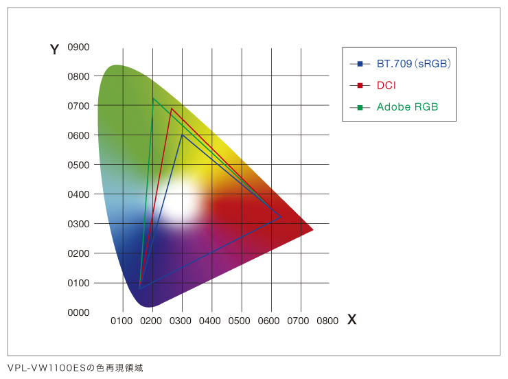 広い色再現領域を持つ「トリルミナス(R)ディスプレイ」に対応。さまざまな赤の色合い、エメラルドグリーンの海や人の肌の中間色など、これまで表現の難しかった繊細な色を色彩豊かに再現することが可能です。また、VPL-VW1100ESでは専用カラーフィルターの搭載によりさらに色再現域を拡大し、DCI(*)色再現域を実現。現在のデジタルシネマ映画館の規格と同等の広色域を実現しました。映画館のスクリーンに描かれる豊潤で美しい色合いをご家庭で堪能できます。さらに信号処理技術の組み合わせでAdobe RGBを始めとする各種モードへの切替も可能です。これまで実現が難しかった高輝度と広色域を高い次元で両立させています。