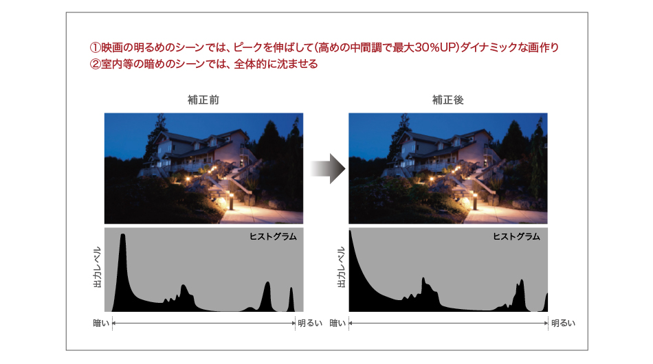 フレーム単位での信号成分をリアルタイムに分析し、最適な階調、コントラストが得られるよう、映像の明るい部分・暗い部分のレベルを自動的に補正。階調表現を向上させることで、メリハリのある、躍動感にあふれた映像を再現します。
