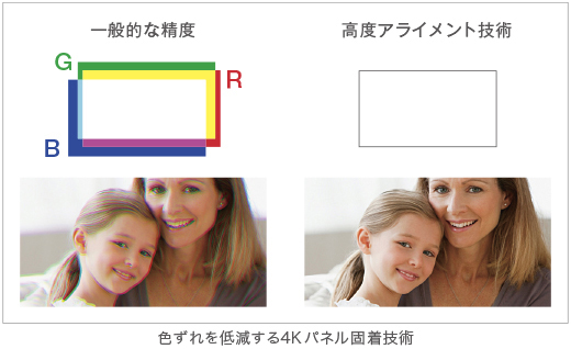 プロ用カメラのイメージャー固着技術をベースに「4K SXRD」固着に展開し、パネルを高解像度化することで各パネルの精度が向上しました。パネルを高精細化することで要求されるパネルアライメントの高い精度を満たすための高度な光学部品設計、そしてより高い要求レベルを満たすための位置補正機能を採用。これにより、画素の色ずれが原因で発生する色の濁りやにじみの少ない、正確な色再現を可能にしました。