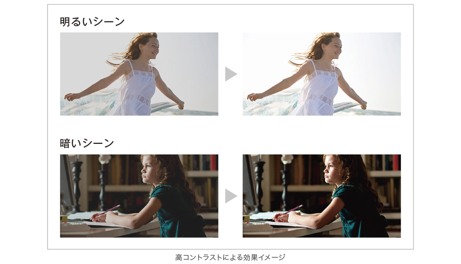 フルHDの4倍を超える画素数を達成した「4K SXRD」パネルは、画素の微細化に加え高品位な画質を実現するために、シリコン駆動基盤の表面を平坦化し液晶層の厚みを均一にしました。光の乱反射を抑え、表示輝度ムラの少ない高コントラストな映像を再現します。