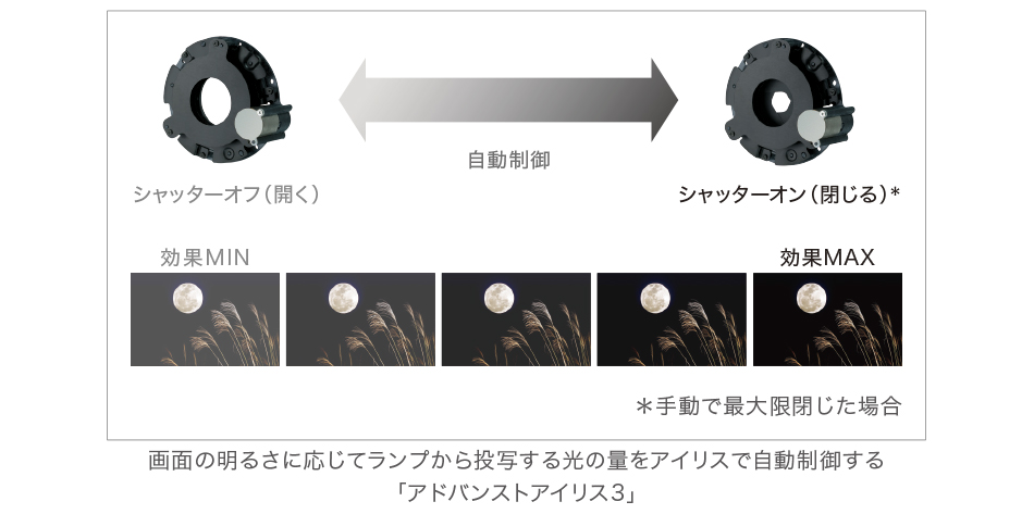 「アドバンストアイリス3」では、映像の白から黒への比率を識別してアイリスを絞ることで、ランプからの光量を映像に合わせ適切に調整します。たとえば光量を下げた場合でも、ピーク輝度を電気処理により、もとの白ピークレベルまで補正。この電気処理により、さらに深い黒を再現することができ、映像のダイナミックレンジを拡大しました。また、高いコントラスト性能を持つ「4K SXRD」や「ハイコントラストプレート」などの組み合わせにより、高コントラスト比を実現。被写体の立体感やディテール、映像の奥行き感をリアルに表現します。