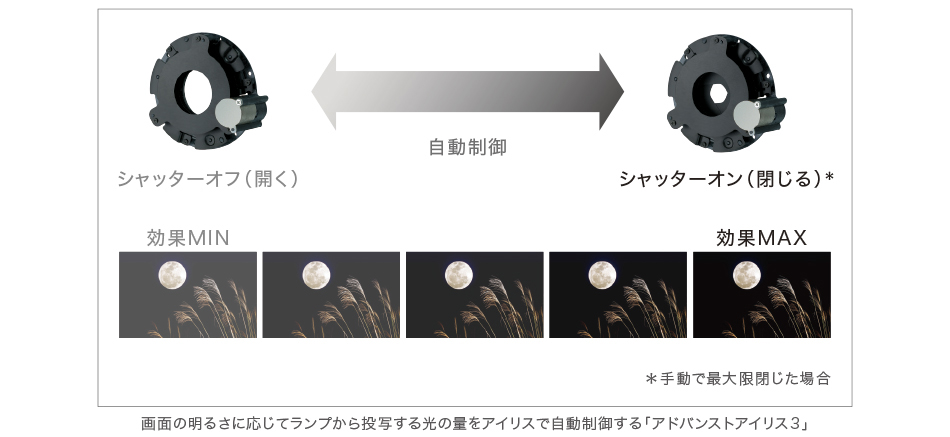 「アドバンストアイリス3」では、映像の白から黒への比率を識別してアイリスを絞ることで、ランプからの光量を映像に合わせ適切に調整します。たとえば光量を下げた場合でも、ピーク輝度を電気処理により、もとの白ピークレベルまで補正。この電気処理により、さらに深い黒を再現することができ、映像のダイナミックレンジを拡大しました。また、高いコントラスト性能を持つ「4K SXRD」や「ハイコントラストプレート」などの組み合わせにより、高コントラスト比を実現。被写体の立体感やディテール、映像の奥行き感をリアルに表現します。