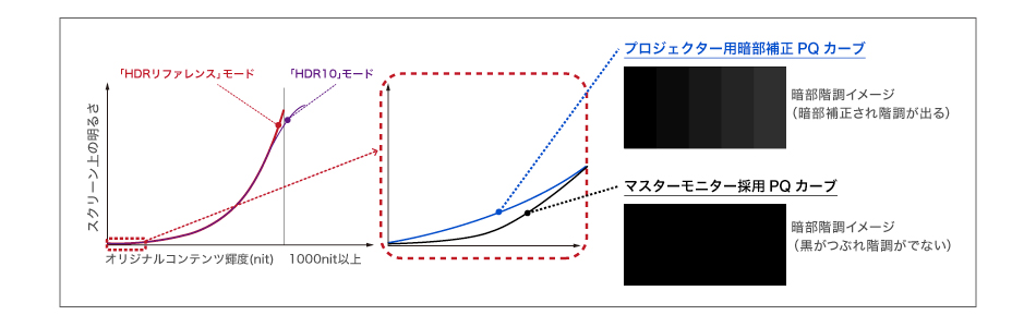 プロジェクターからスクリーンに投影し反射した映像の輝度は光が減衰し暗部が圧縮されることで沈みすぎてしまい階調が見えにくくなります。マスターモニターを使ってHDRコンテンツの調整を行う際に見えていた暗部の階調をプロジェクターでも再現できるようにPQカーブの暗部をプロジェクターの輝度で最適となるようにHDR10、HDRリファレンスともに補正し、暗部階調表現を向上させました。