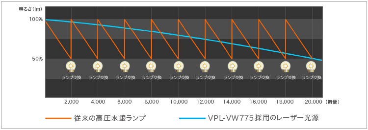ホーム用ビデオプロジェクターの光源にレーザー光源(Z-Phosphor)を採用。力強い映像表現と純度の高い色再現が可能になり、迫力とリアリティーに満ちた4K映像を描きだします。また、従来のランプ光源の寿命よりも長い、約20,000時間(*2)の長時間使用が可能です。