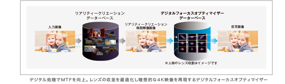 ソニー独自の「データベース型超解像処理LSI(リアリティークリエーション)」を搭載。入力された映像ソースをリアルタイムで解析し、数千パターンに分類。データベース上に存在する最適な画像(絵柄)と照合し、オリジナルの映像信号がもつ質感やディテール感、さらに、映像データの編集や伝送で失われてしまった情報までも復元します。また、VPL-VW775では、リアリティークリエーションの超解像に加え、デジタル処理でMTF(*)を向上させる「デジタル フ ォーカス オプティマイザー」を搭載。レンズの収差を画面上の座標と画質のパターンから最適化するとともに、輪郭部分を自動検出し強調処理を自動で行うことで、映像本来の美しさをより忠実に再現し理想的な4K映像を提供します。