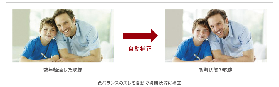 長時間使用する中で、プロジェクターの色バランスには少しずつズレが発生します。それを補正するのが「オートキャリブレーション」機能です。本体に内蔵されたカラーセンサーが投射光を解析し、初期状態からの色バランスのズレを判定。本体メニュー画面から「オートキャリブレーション」→「調整」を選択するだけで、ホワイトバランスなどカラーマネジメントを補正します。別売の光学センサーやパソコンなどは不要なため、手間なく簡単に高品位な4K映像をご堪能いただけます。また、「プリチェック」機能により色のズレ度合を数値で確認できるため、キャリブレーションが必要な状態かを確認することもかんたんです。