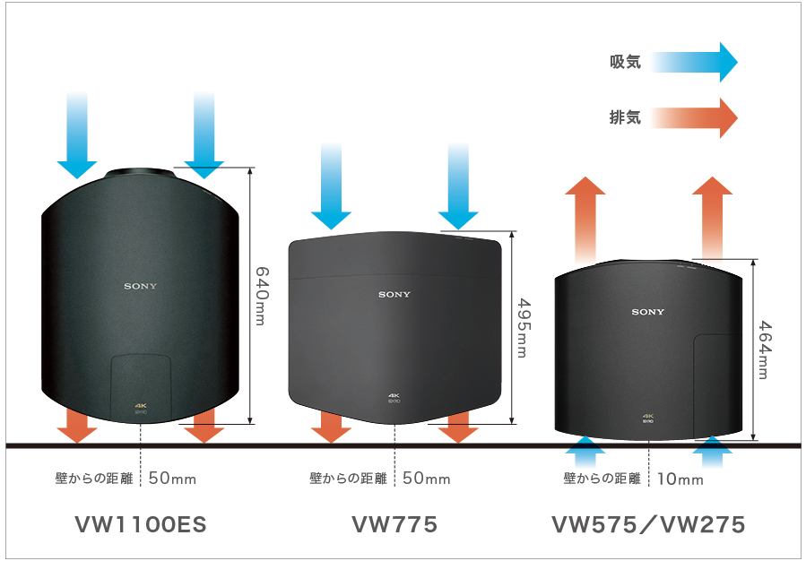 レーザー光源搭載ながらもコンパクトなデザインで、置き場所の制約を最小限に抑えました。また、前面吸気、背面排気方式を採用。排気の熱い空気による影がスクリーン上に映る(陽炎現象)の影響による画質低下を抑えました。