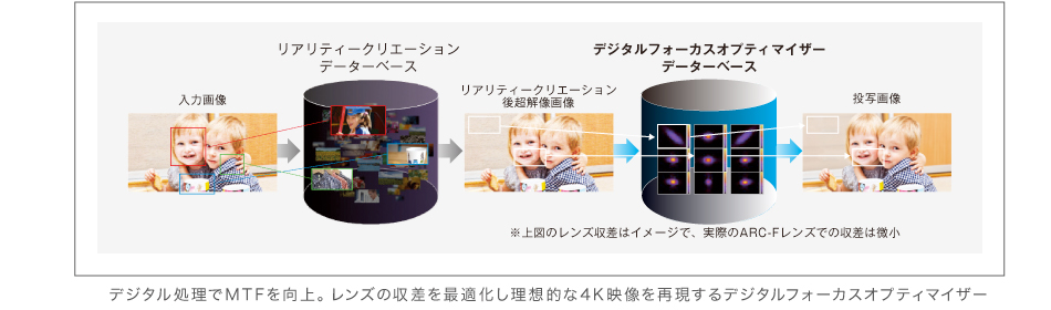 ソニー独自の「データベース型超解像処理LSI(リアリティークリエーション)」を搭載。入力された映像ソースをリアルタイムで解析し、数千パターンに分類。データベース上に存在する最適な画像(絵柄)と照合し、オリジナルの映像信号がもつ質感やディテール感、さらに、映像データの編集や伝送で失われてしまった情報までも復元します。また、VPL-VW855では、リアリティークリエーションの超解像に加え、デジタル処理でMTF(*)を向上させる「デジタル フ ォーカス オプティマイザー」を搭載。レンズの収差を画面上の座標と画質のパターンから最適化するとともに、輪郭部分を自動検出し強調処理を自動で行うことで、映像本来の美しさをより忠実に再現し理想的な4K映像を提供します。