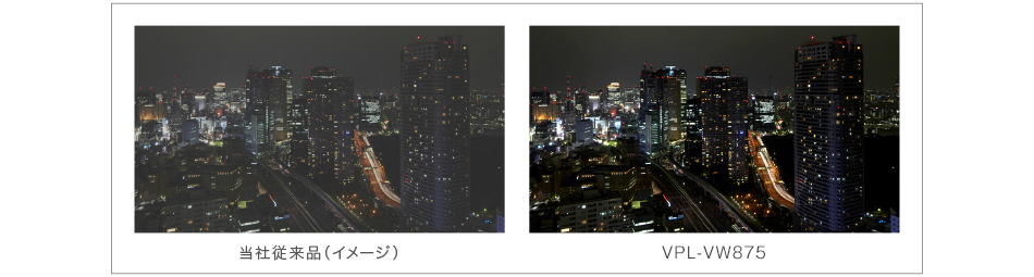 パネルに光を反射させて投写するプロジェクターでは、シーン内に明部と暗部が混在する時、明部を重視すると暗部が浮き、暗部を重視すると明部が沈む傾向があります。「ダイナミックHDRエンハンサー」は、フレームごとにダイナミックレンジを調整し、明るいところは明るく輝かせ、暗部はアイリスや光源の制御を連動させ、黒をより沈みこませることにより、従来機に比べHDRコンテンツに対して最適なコントラストを提供いたします。
