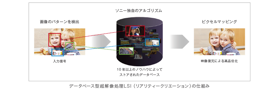 ソニーが十数年培ってきた超解像技術開発に伴うノウハウに新規技術を加えた「データベース型超解像処理LSI(リアリティークリエーション)」を搭載。フルHD解像度の映像信号(3Dを含む)をより高精細な4K(水平4,096×垂直2,160画素)映像信号に変換します。ソニー独自の「データベース型超解像」においてパターン分類手法を「学習型」に進化させることで、分類性能をさらに向上させ、入力された信号を「どのような特性を持つ映像なのか」を解析し、画像に合わせた最適な超解像処理を可能にしました。また、入力画像の品位(ノイズ量、信号帯域など)を計測・解析し、その結果に基づき超解像処理とノイズ除去を自動的に制御することで、さまざまな入力信号に対する高画質化を実現。これにより、きめ細やかで高品位な4K映像の生成を可能にしました。