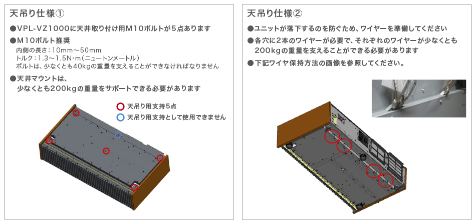 本機は天吊りも可能です。天吊り金具をご使用の際は、本項目の条件を満たし、落下防止対策を行ってください。本体背面の寸法については、「取扱説明書P.48」をご覧ください。なお、天吊り金具の販売(受注生産)は『株式会社 キクチ科学研究所』様で行っておりますので、 http://www.kikuchi-screen.co.jp/contact/を確認の上お問い合わせください。
