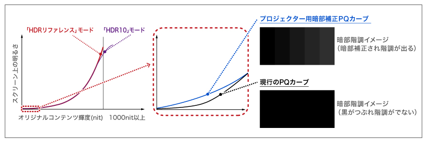 プロジェクターからスクリーンに投影し反射した映像の輝度は光が減衰し暗部が圧縮されることで沈みすぎてしまい階調が見えにくくなります。マスターモニターを使ってHDRコンテンツの調整を行う際に見えていた暗部の階調をプロジェクターでも再現できるようにPQカーブの暗部をプロジェクターの輝度で最適となるようにHDR10、HDRリファレンスともに補正し、暗部階調表現を向上させました。