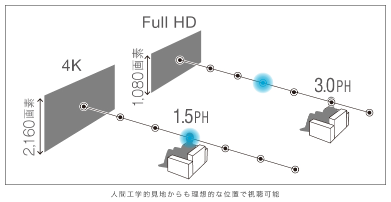 プロジェクターで投写されているスクリーンに近づくと、投写デバイスの画素が目立つため臨場感や奥行き感が損なわれますが、「4K SXRD」プロジェクターでは、画素が微細なため、スクリーンの高さの1.5倍まで近づくことが可能となりました。この距離におけるスクリーンに対する視野角は60度です。頭を左右に振らずに視野いっぱいに映像が入り、人間工学的見地からも理想的な位置で視聴でき、映像への没入感を生みだします。