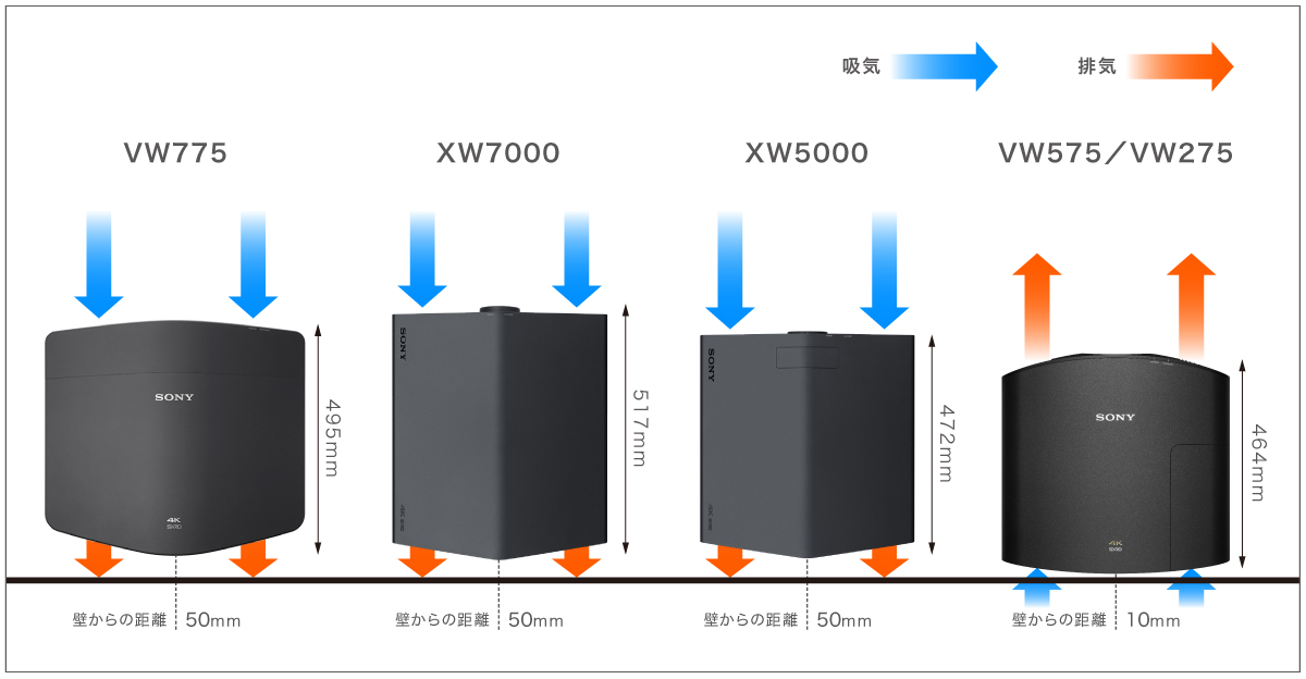 * 後方の壁に近接配置しているVW500系、VW300系、VW200系からの入替を検討されている方は、XW系は背面排気のため天吊り金具の位置の変更が必要になる場合がありますので事前にご確認ください