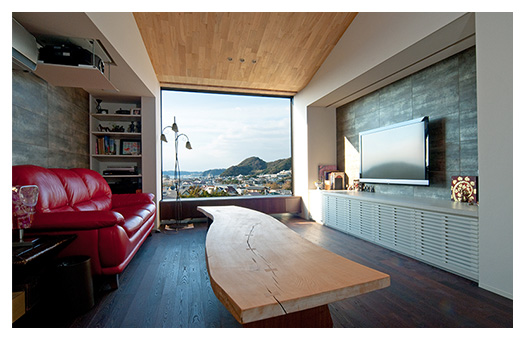 - 地下にあるような閉塞感のあるシアタールームにこもって映像を観るのが嫌だったので、「普段、自分が生活している開放的な空間でシアターを観たい」「窓からの景色とマッチした空間にしたい」と希望しました。そして、「とにかく、大画面で楽しみたい」ということもお願いしました。