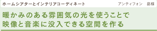 ホームシアターは“非日常”にひたる空間として、照明による空間の演出や吸音材の使用と映像と音の迫力や現実感を追求するさまざまな工夫をほどこします。映像と音の追求と聞くと、AV機器と住空間のマッチングに不安を感じる方もいるかもしれません。オーディオ業界には、音の響きだけを追求してコンクリートブロックをスピーカーの台座にすることをよしとするような時代もありました。“非日常”を楽しむホームシアターですが、日常空間に“非日常”をそのまま置くことはよくありません。日常を構成するインテリアや建築の考え方にはオーディオと通じるものがあると思います。好き/嫌いという単純な分け方もありますが、それだけではないんです。このイメージがあるからこの照明を使っている、だからそのイメージに合うこんな雰囲気の音を聞きたい、という考えの流れが必ずあります。考えの流れをとらえることで、“非日常”を追求しながら同時に日常やインテリアにおさまりのいいホームシアターを作ることが可能になります。