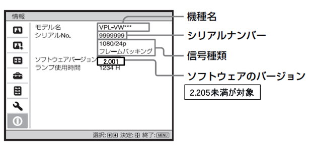 プロジェクターの電源を入れ、情報メニューで、ソフトウェアのバージョンが「2.205」未満となっていることを確認してください。