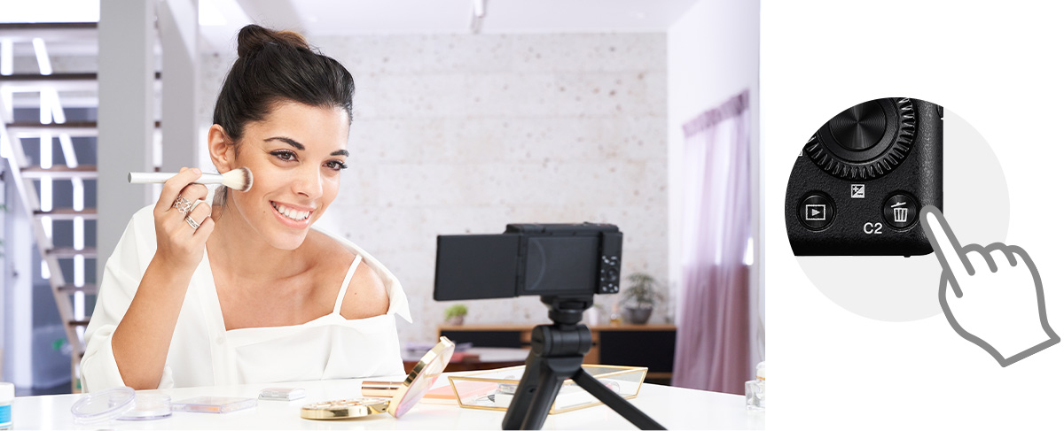 おすすめの商品を紹介するとき、カメラに向けた商品にピントが合わなくて困ったことはありませんか?「商品レビュー用設定ボタン」をひと押しすれば、顔から商品へ、商品から顔へのピント合わせがスムーズに行えます。