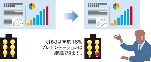 6灯ランプのうち、1灯が切れても輝度は約16%ダウンするだけで、プレゼンテーションは継続できます。
