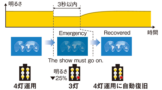 4灯/3灯/2灯での運用を選択した場合、使用しているランプのひとつが切れてしまった場合、使用していないランプが3秒以内に自動的に点灯して輝度を自動で復旧させることができます。