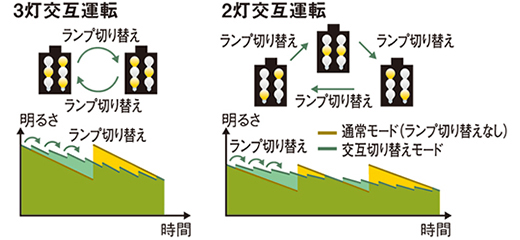 3灯/2灯での運用時には、交互ランプ切り替えモードを選択することで、24時間連続運用時などにおいて投写輝度の変化を少なくし、メンテナンスサイクルを延長することができます。