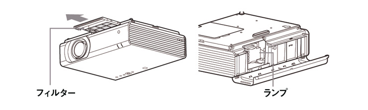 フィルターはスライド式で前面から引き出すことができ、ランプは背面から取り出しが可能なため、天吊り時もメンテナンスが容易です。