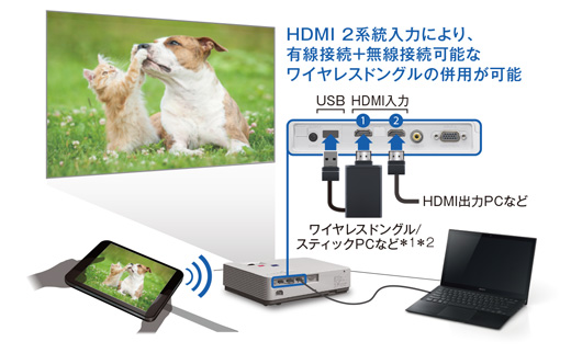 HDMI2系統の有線接続だけでなく、USB端子から5V/2Aの給電ができるので、HDMIの有線接続と無線接続可能なHDMI端子付きのワイヤレスドングルやスティックPCとの併用も可能です。