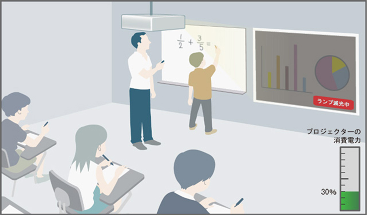 ・映像投写中でも、画面に一定時間動きが無い場合は自動でランプ出力を徐々に絞る「ランプ減光モード」を搭載しています。
