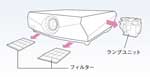 ランプ交換は横から、フィルター掃除は前面から行うため、天吊状態でも容易に対応できます。