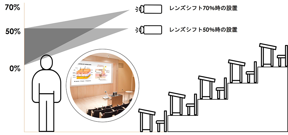 上下方向にスクリーン全高の70%から-5%、左右方向でスクリーン全幅の±32%のレンズシフト(*)が可能です。レンズの可動域が大きいことで、投影位置や投写距離の選択肢が広がり、柔軟な設置に対応できます。高い位置に設置してプロジェクターより低い位置にあるスクリーンへの投影ができるため、プレゼンターが投写光から受ける影響を減らすことができます。