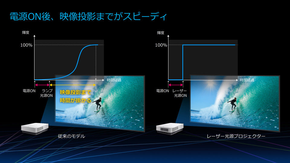 レーザー光源を使用しているため、電源オンボタンを押してから数秒で立ち上がる便利さを実現。授業や会議をスムーズに開始できます。さらに電源オフの際も、クーリングが不要なため、短時間で済みます。